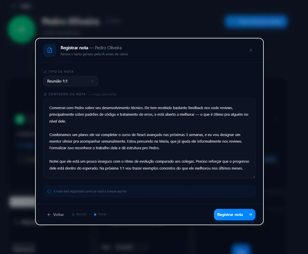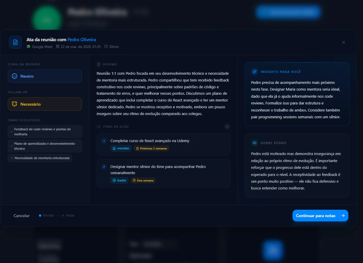 “Antes de cada 1:1 eu consulto o histórico e já sei exatamente o que foi combinado, o que evoluiu e onde preciso dar mais atenção. A conversa rende muito mais quando você chega com esse nível de contexto.”