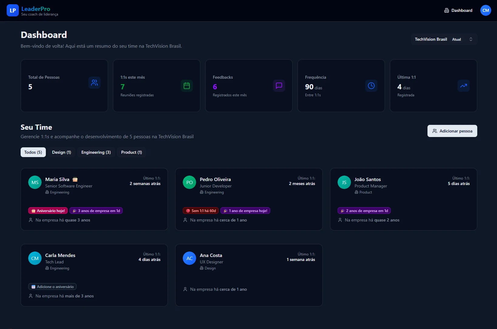 1:1s produtivos, decisões precisas, time engajado. Liderança com contexto total.